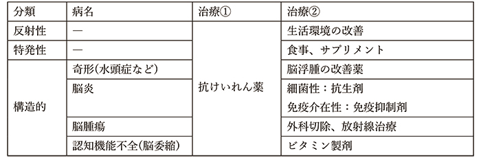 前述のとおり、てんかんといっても様々な病気が背景にあります。以下の表は原因によっての治療法を簡潔にまとめたものです。実際には画像結果や本人の症状に合わせて複合的に対応するケースがほとんどです。